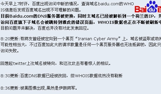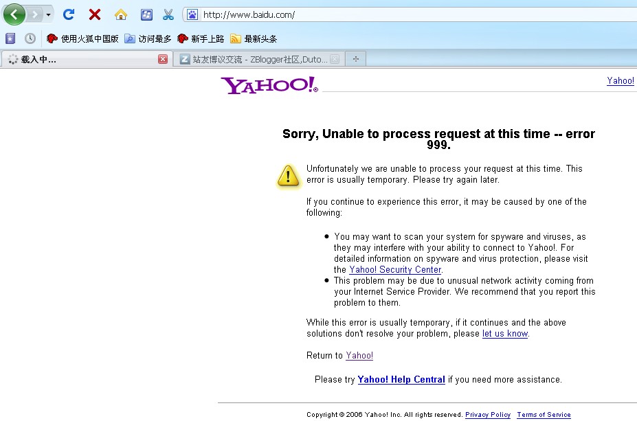 今天早上刚上线就看到网友的留言,问是不是百度挂了,这个我哪里会相信啊,随即在地址栏输入百度的网址果然没有打开,过了片刻刷新后错误的信息居然是Yahoo的:
